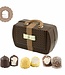 Dit lieve, grappige handtasje, versierd met een vrolijk strikje, is er in de chocolade smaken melk, puur en wit. De contrasterende chocolade kleuren voor de details maken het tasje helemaal af. Een prachtig modeaccessoire waar je menig meisje of vrouw helmaal gelukkig mee zult maken. Vooral door de combinatie van tas, chocolade en zoenen. Dat is driedubbel plezier. Eerst genieten van het mooie uiterlijk van het Chocolade Handtasje dat nog even mag pronken op de cadeau tafel. In de tussentijd al je tanden zetten in een van de twee verrukkelijke Chocozoenen die wij erbij uitgezocht hebben met een luchtige schuimvulling in fruit, drank of noten smaken.
